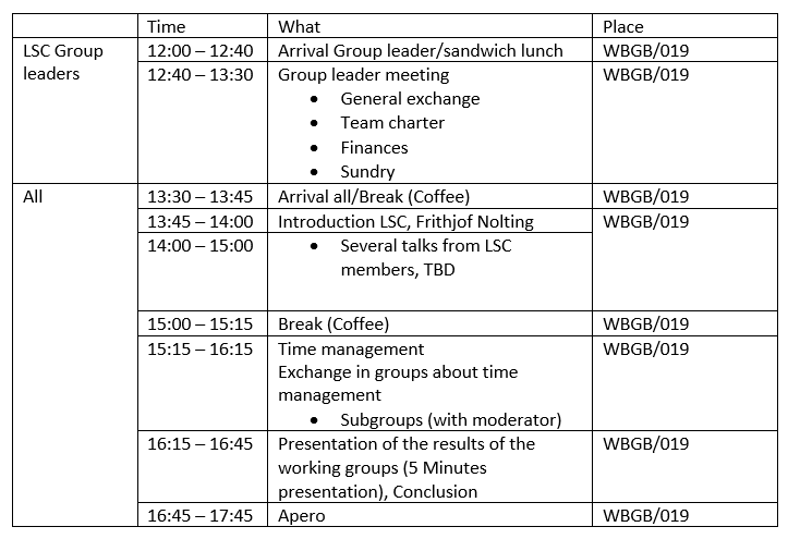 The main aim of this mini retreat is to meet personally, to see who is in LSC, what has changed and have a starting point for future discussions. It will be more an informal meeting and not a scientific conference. At the last retreat we concluded that more knowledge about time management would be good. We will address this in two steps, an input seminar on 22.01.2026 and group work on 18.02.2026.