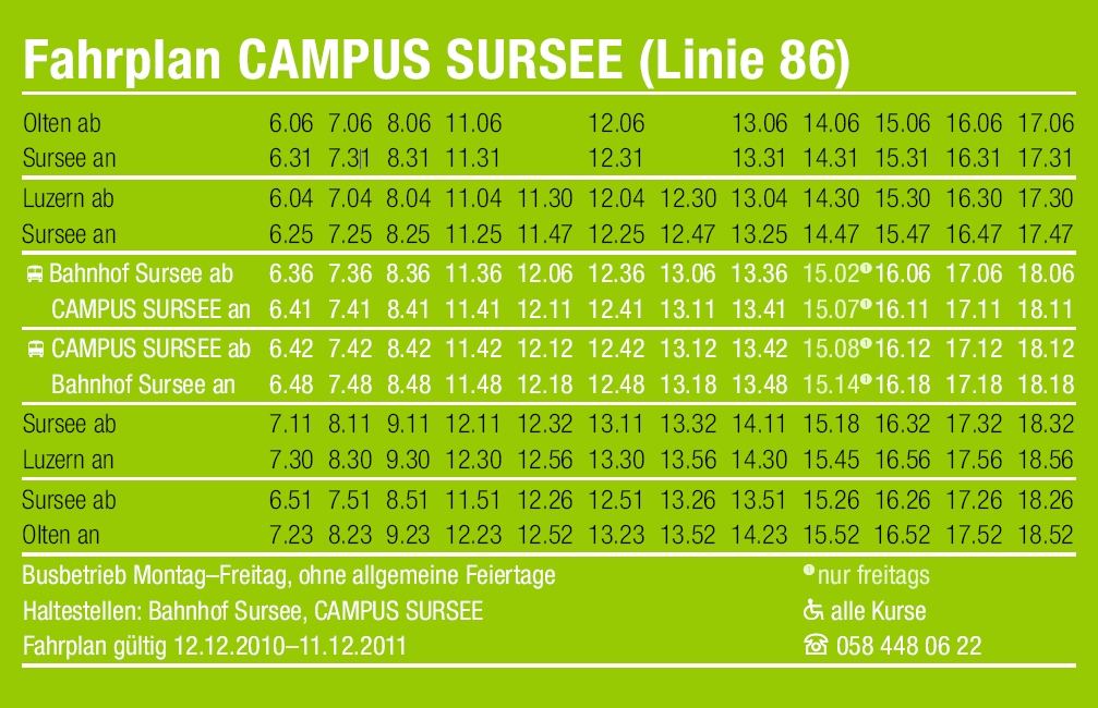 Check out www.sbb.ch for train connections to Sursee. From Sursee train station, take bus number 86 to CAMPUS Sursee (7 minutes). The last bus leaves at 18:06 ! Check this time table for train / bus connections.