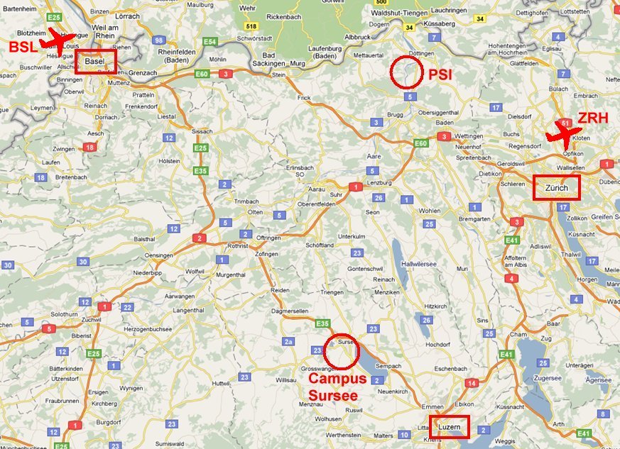 We recommend to fly either to Zurich Airport or EuroAirport Basel Mulhouse Freiburg from where Sursee can easily be reached. From Zurich Airport there are trains to Sursee (change trains in Olten), from EuroAirport Basel Mulhouse Freiburg there is a shuttle bus to Basel railway station every 10 minutes, from where direct trains go to Sursee. EuroAiport is located in France, in the tri-national Upper Rhine Region, i.e. very near to Switzerland and to Germany.